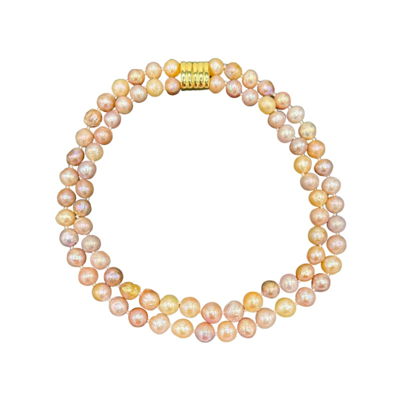 This 18" necklace features a stunning double strand of pink freshwater cultured Edison pearls, meticulously double-knotted on silk for a luxurious, secure drape. These pearls showcase the brilliant luster and natural rosy hues unique to the Edison variety, finished with a gold-plated magnetic clasp that offers both effortless wear and a polished, high-end glow.
