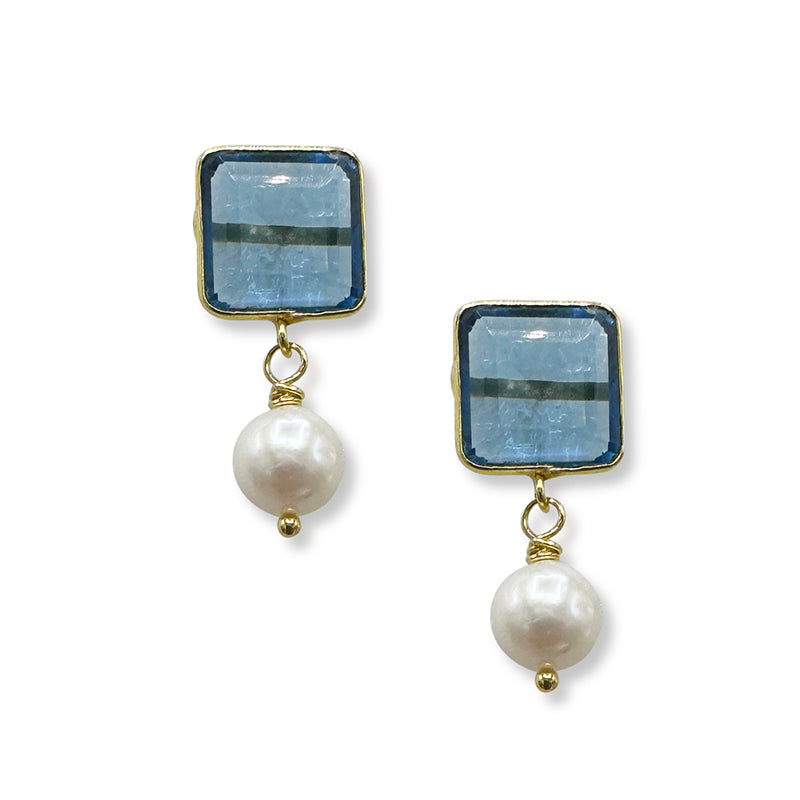 These striking earrings feature a vibrant square blue crystal paired with a substantial 12mm round white freshwater pearl drop. Set on a gold-plated post with an approximate 1" drop, the geometric precision of the crystal provides a brilliant pop of color against the classic, creamy luster of the pearl.