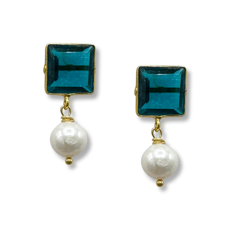 These striking earrings feature a vibrant square teal crystal paired with a substantial 12mm round white freshwater pearl drop. Set on a gold-plated post with an approximate 1" drop, the geometric precision of the crystal provides a brilliant pop of color against the classic, creamy luster of the pearl.