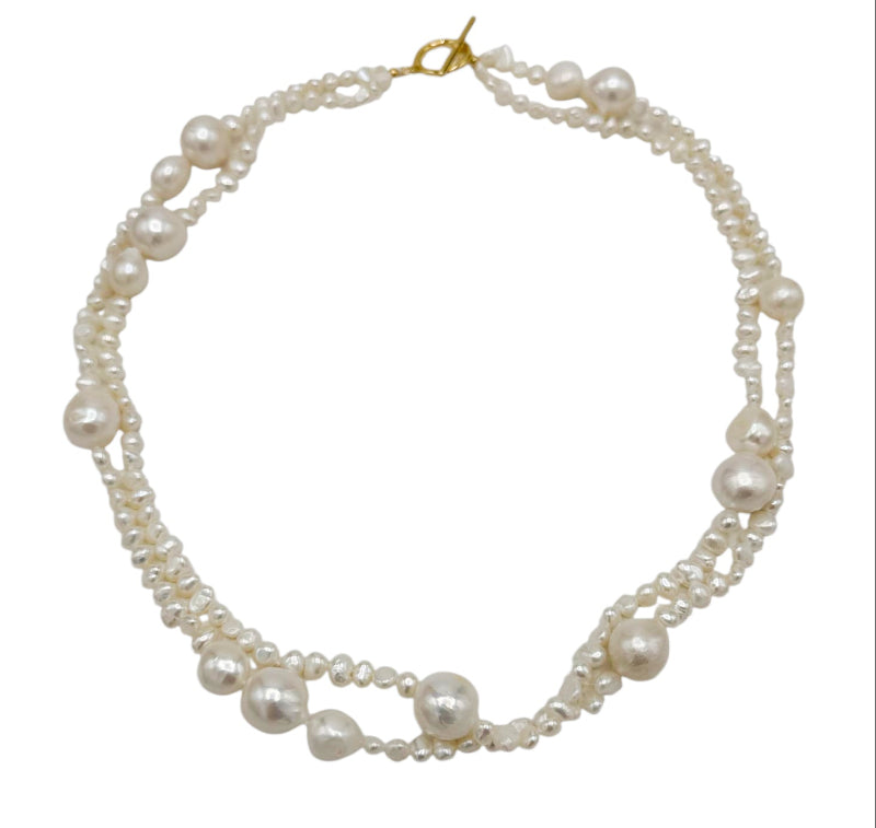 This 18" double-strand necklace features luminous white Keshi freshwater pearls, celebrated for their unique, petal-like shapes and extraordinary natural luster. Finished with a sophisticated gold-plated toggle clasp,