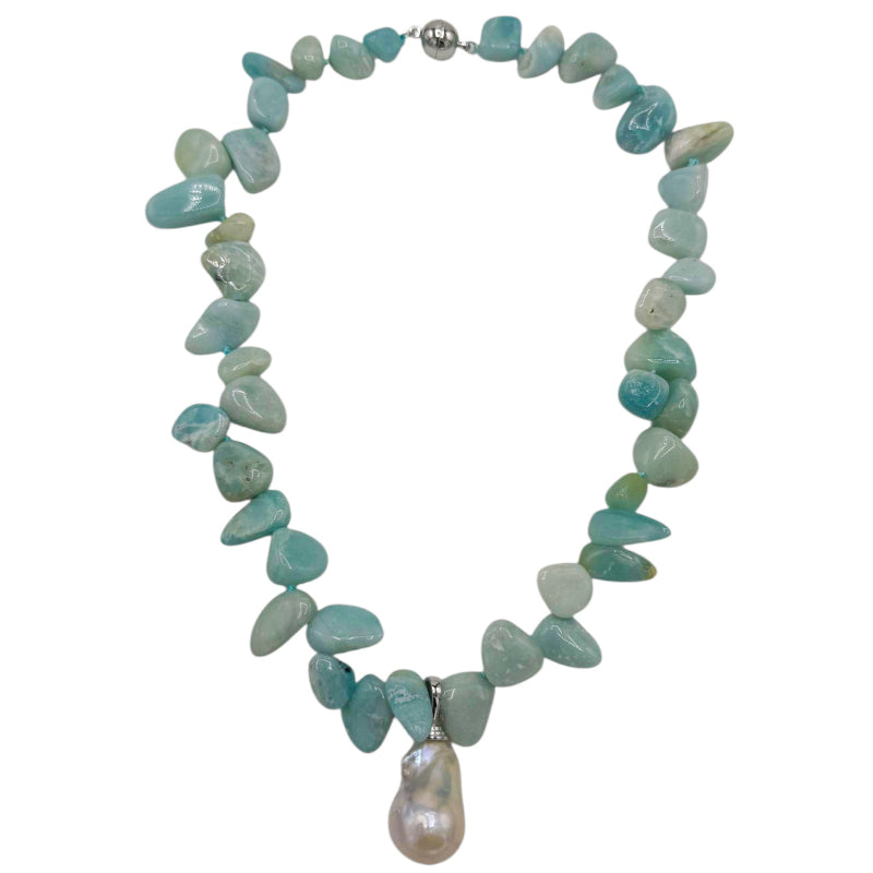 This 18" necklace offers two looks in one, featuring the dreamy, sea-glass hues of stacked Amazon Quartz stones. Double-knotted on silk for a soft drape, it features a  white freshwater Baroque wild pearl on a detachable silver bail—clip it on for a statement or remove it for a clean, earthy look. Complete with a silver magnetic clasp, it’s a versatile, easy-to-wear piece.