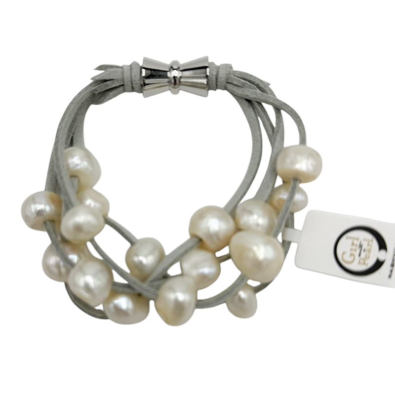 4-strand Freshwater Cultured White Bam Bam Bracelet on Fawn Vegan Suede w/ Rhodium Plated Stainless Steel Magnetic Closure. Matching Necklace Available.