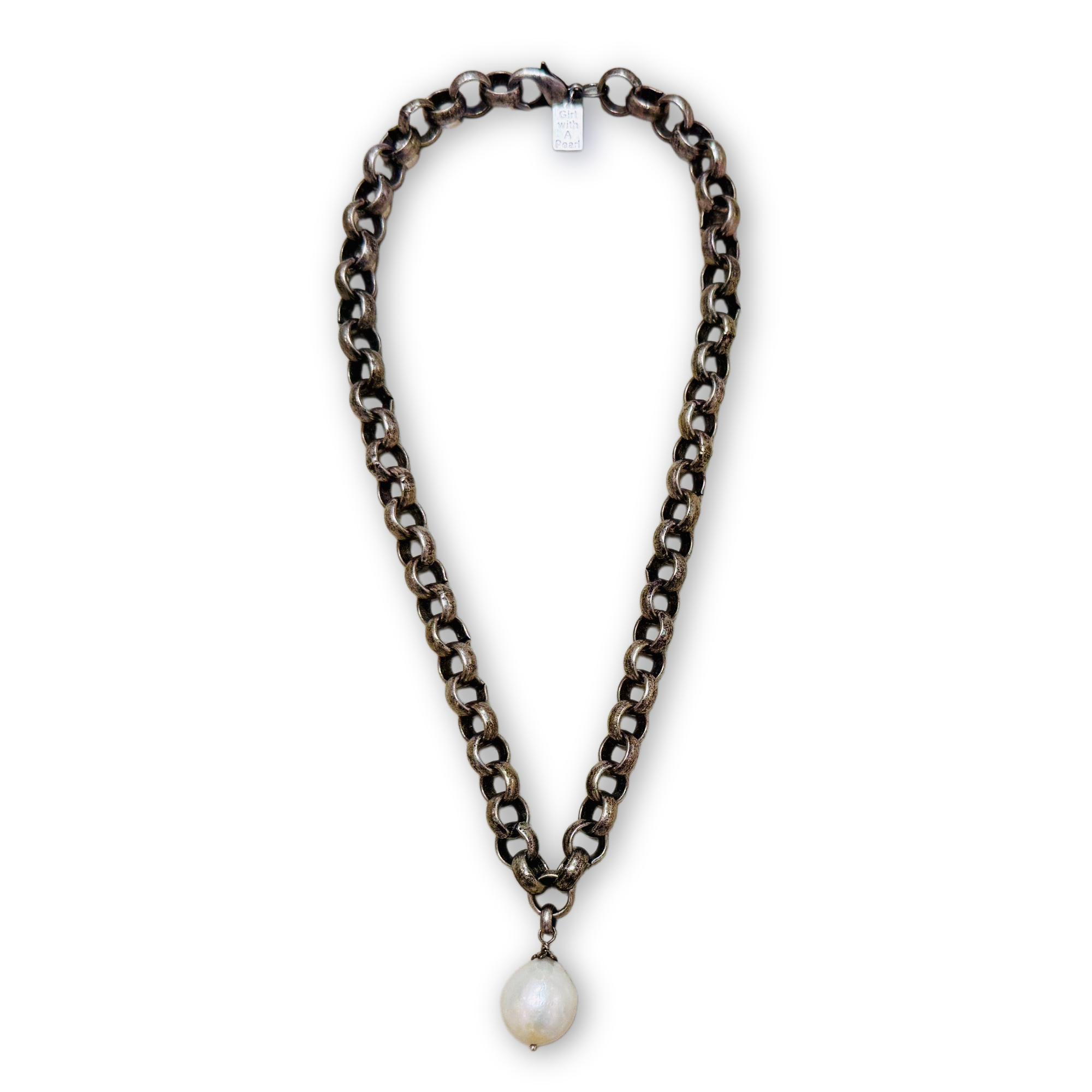 Turkish Antiqued Silver Chain Choker w/ Large White Freshwater Cultured Baroque Edison Pearl Drop w/ Lobster Clasp 18."