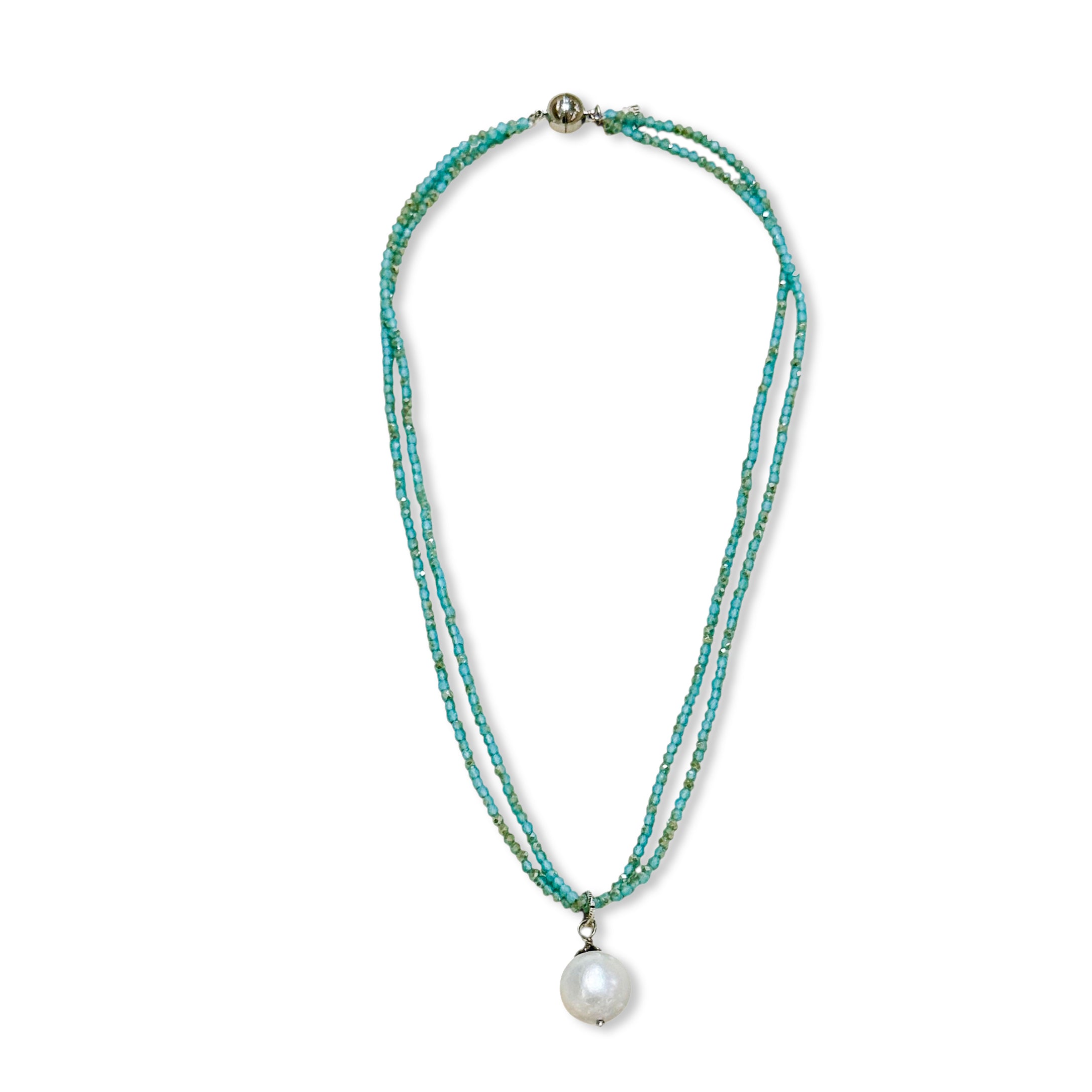 Double Strand Turquoise Crystals w/ 16mm White Freshwater Cultured Edison Pearl Drop on Rhodium Plated Stainless Magnetic Ball Clasp 18."